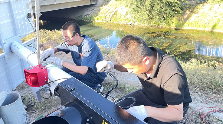 公司实施工程师在顶着40多度的高温下进行杆件基础建设、设备组装、立杆、调试等工作。