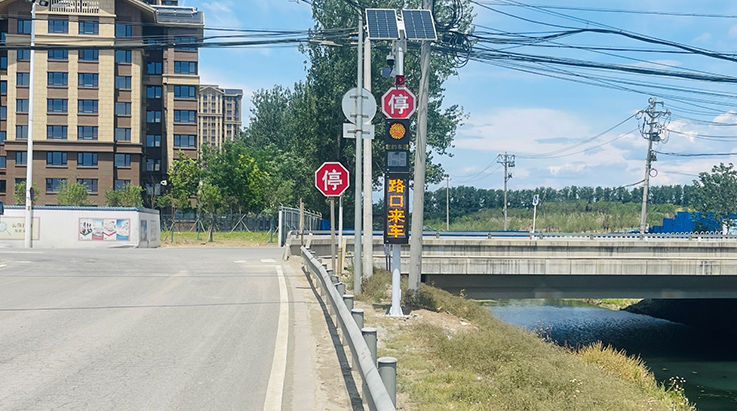 基于通过声、光预警提示支路进入路口的车辆停车让行,MPD073支路预警装置安装在支路距离路口出口处10-20米左右,公路右侧,距道边1米路肩处。