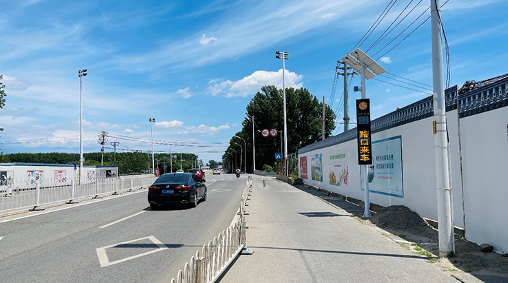 基于合理控制/降低城市主路进入道路交叉口车辆的速度,按照当前位置限速60公里/小时,驾驶人在观察到预警系统提示后减速进入路口,保持合理车速通过路口,MPD073主路预警装置安装在主路距离路口入口处50-80米左右,公路右侧,距道边1米路肩处,东、西向各一处。