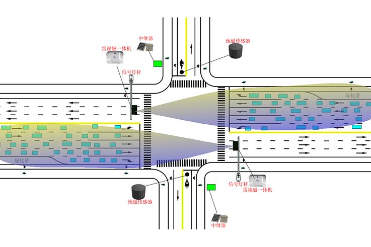 以主路与支路道路等级差距较大的交叉口为例,主路交通流量大、交通状况复杂,所需要多种交通指标才能描绘交叉口运行状态,可用雷达输出流量、排队车辆数、速度等空间交通流数据;视频识别车辆类型、行驶轨迹、车辆颜色等更加微观场景的交通流数据;支路交通流量少、交通状况清晰明了,仅需少量交通指标即可描绘交叉口运行状态,可用地磁输出车辆压占状态,检测车辆通行需求或申请跳相位。雷-视-磁一体机可将交叉口所需的多种交通数据,传输给信号机、平台等,用于交通管理与控制。